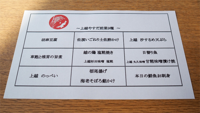 前菜のリストも見ることが出来て楽しいです。お気に入りは海藻系の佐渡いごねりでした。