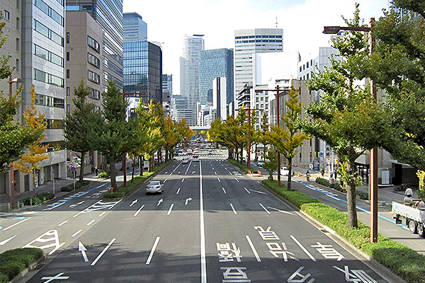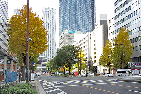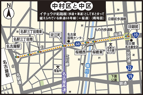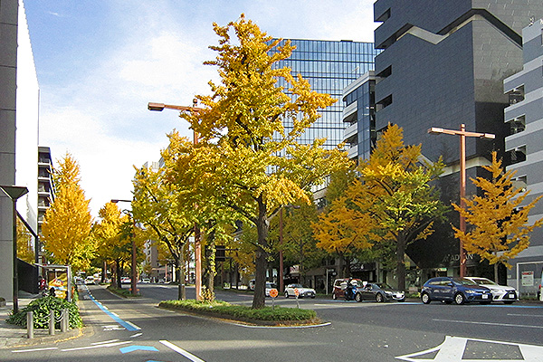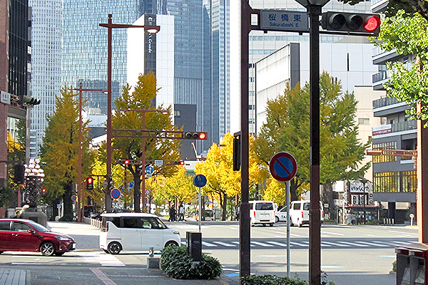 イチョウ並木の範囲は、中村区名駅五丁目(西端)から中区錦一丁目(東端)の約1.1キロで、西端は名古屋駅、東端は「日銀前」交差点となっています。