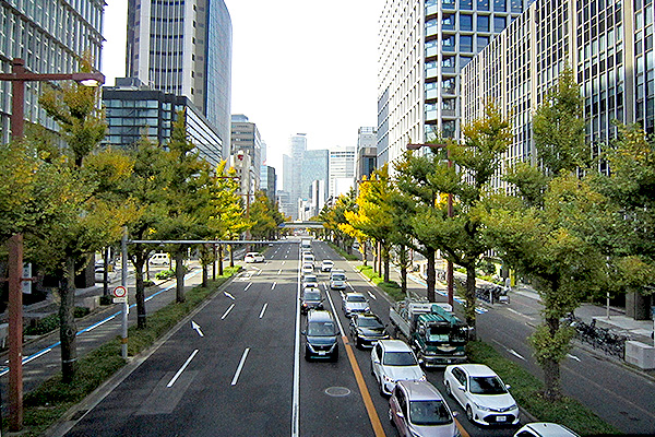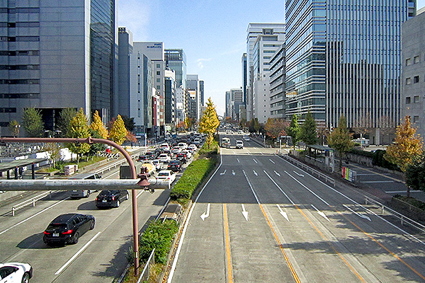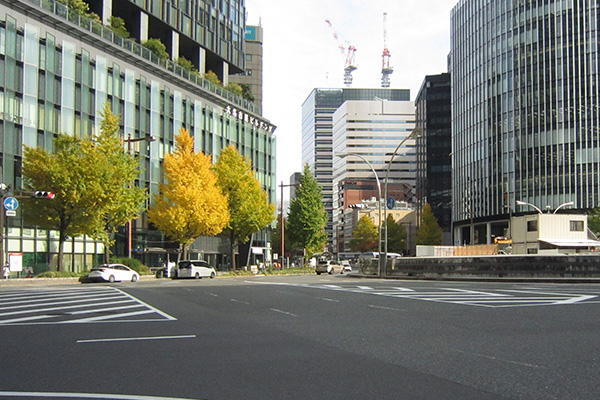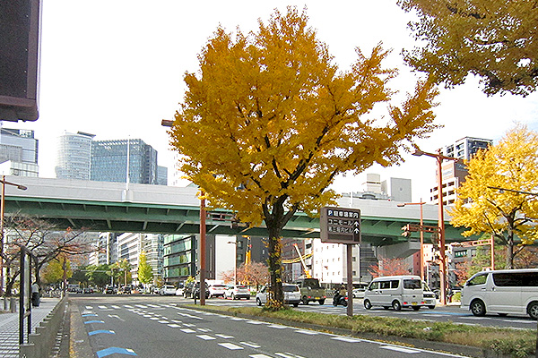 「日銀前」交差点から東方面には緩速車線はなく、歩道と中央分離帯に多様な街路樹が植えられており、まばらにイチョウの姿も見られます。