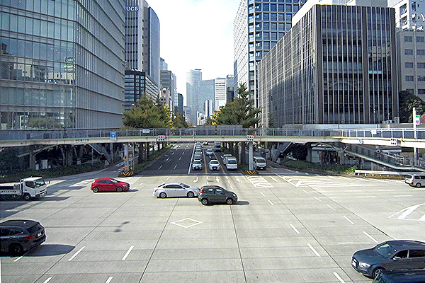 桜通(東西)と伏見通(南北)が交差する「日銀前」交差点には横断歩道がなく、四角形に歩道橋が巡らされています。