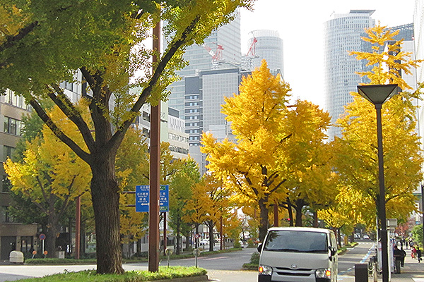 名古屋駅の高層ビル群を背景に立ち並ぶイチョウの木々。