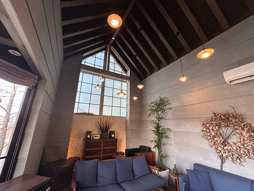 少し離れたところにある建物内もチルタイムを過ごすには相応しい空間。外の光や風景を活かしたその空間づくりに心落ち着き、癒される。