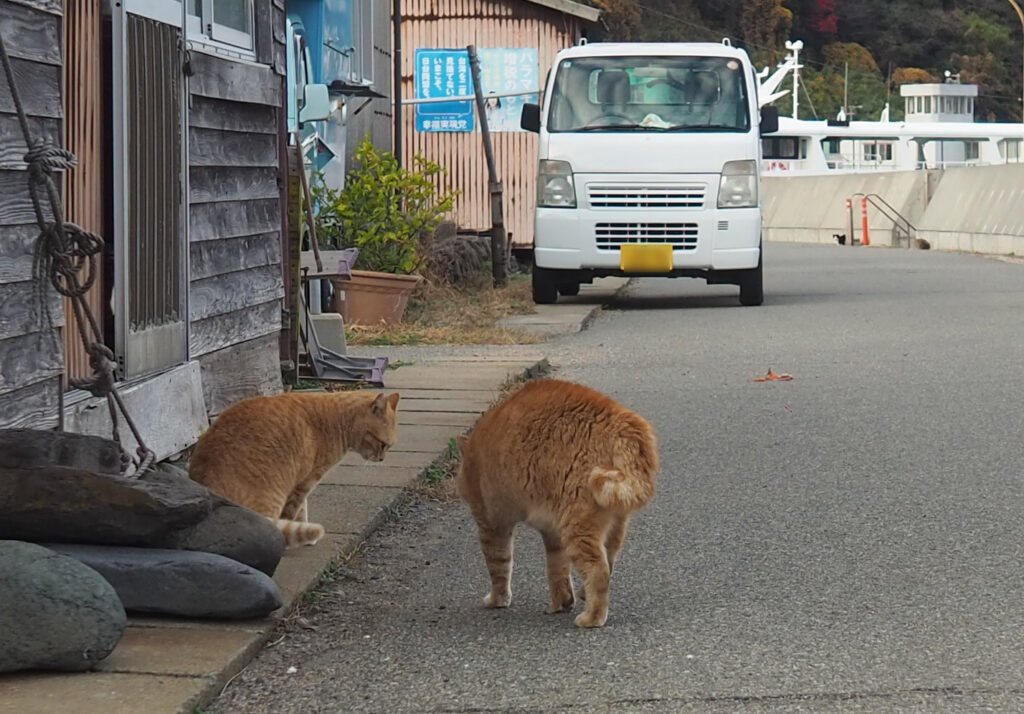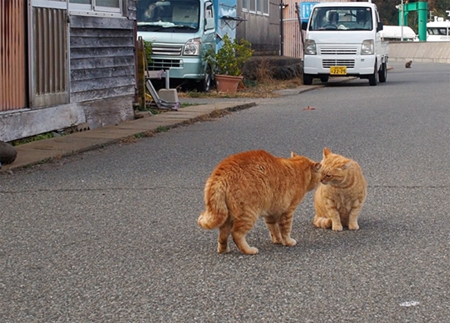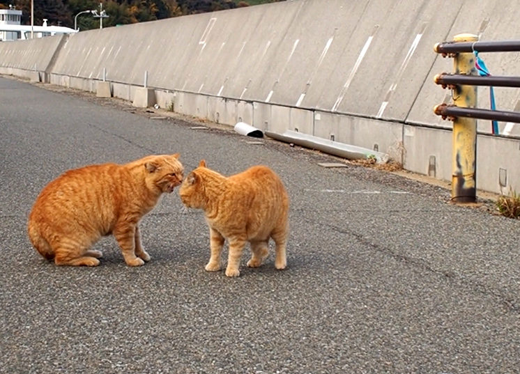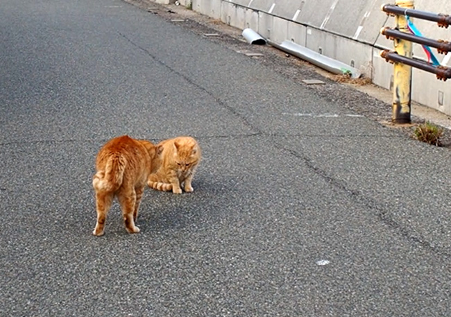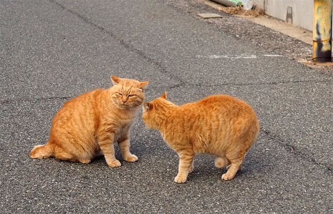 道で休んでいる茶トラさんに大柄の茶トラさんが近づいていきます。