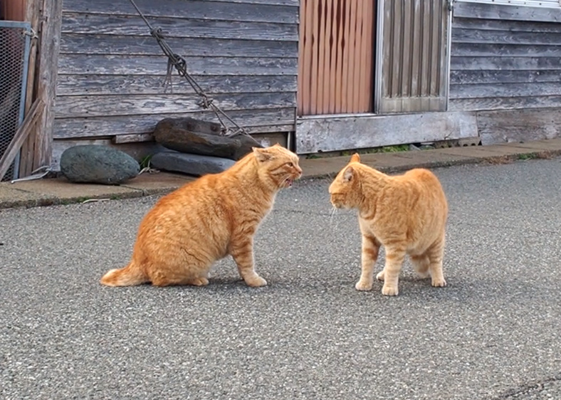 横からにらみつけます。右の茶トラさんは尻尾が完全に巻いてしまっています。