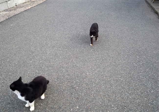 うわあ、後ろから黒多めの白黒さんが接近してきます。さきほどのシチュエーションと似ていますね。