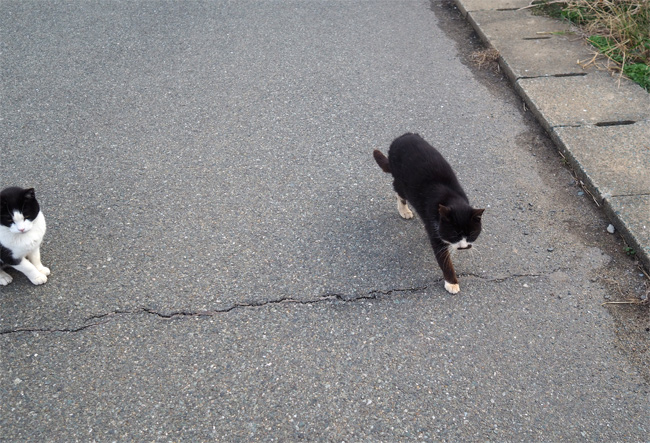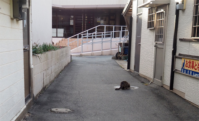 町の方へ戻ると、キジトラさんが水たまりの水を飲んでいます。水飲み場所があるので、そこで飲んだ方がいいのにとも思うのですが、たまにはこっちの方が良いのでしょうね。
