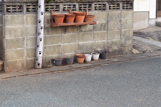 フェリー乗り場を抜けて先に逝くと、猫さんの足跡柱が登場です。