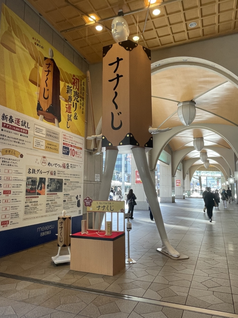 これまで弁財天さまや鏡餅に変身してきたナナちゃんが今年は妹のミナちゃんとおそろいの「おみくじ」の姿になって、今回のWチャンスくじをPRしています。Wチャンスくじは「ナナ万枚」(70,000枚)限定、1月2日(月・休)~1月10日(火)の期間中先着順で、税込み1万円(割引後・1レシート)ごとに配布。※金券類、食品・レストラン、店外掛、電話注文、7階催場のほか一部配布の対象外の店舗があります。引き換え方法や利用対象外の店舗など詳細はこちら(https://www.e-meitetsu.com/mds/event_brand/2023chansekuzi/)