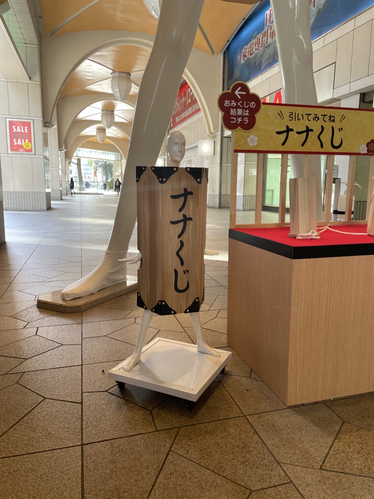 ナナちゃん前には、「凶」や「ナナ吉(超大吉)」などのくじが入っているおみくじ「ナナくじ」が設置されています。くじは、七=吉、十七=中吉、二十七=小吉、三十七=大吉(ミナ吉)、四十七=末吉、五十七=凶、六十七=吉、七十七=超大吉(ナナ吉)の計8種類。それぞれのくじのコメントはナナちゃん横の壁面に掲載されています。「ナナくじ」で運勢を占ってみてはいかがでしょうか。※参加無料