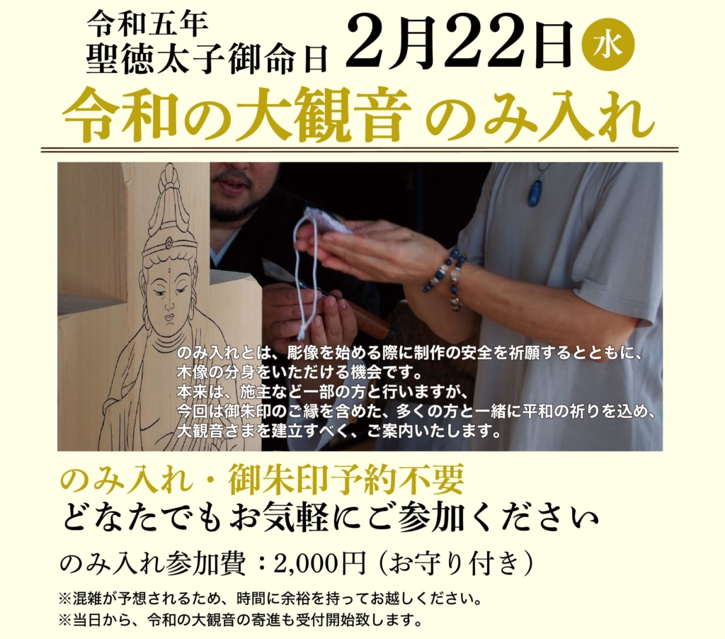 四天王寺では、昨年2月22日にお披露目した聖徳太子の観音さまに続き、総高4メートルの令和の大観音さまを新たに建立します。この令和の大観音さまののみ入れが同日の9時~16時に実施されます。(予約不要・参加費2000円)