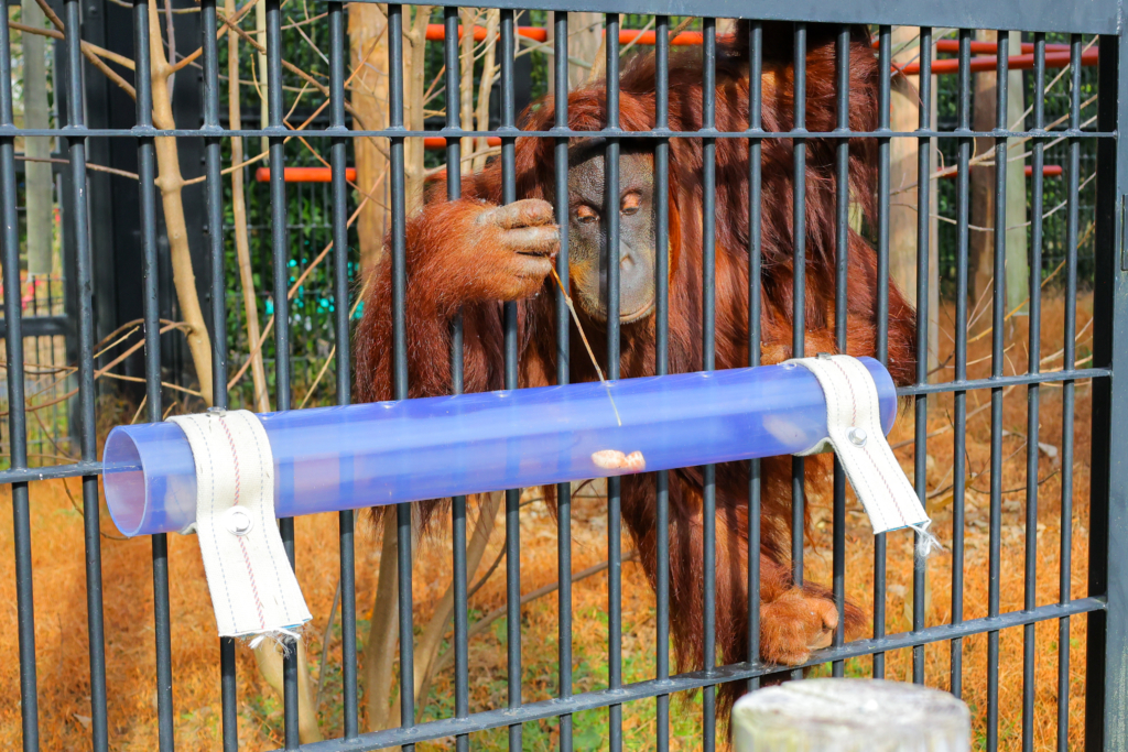 動物の食事シーンが見られる「どうぶつウキウキスポット」では、アジアゾウをはじめ、エサを探すレッサーパンダや給餌器内のエサを枝で器用に取るオランウータンなど、貴重な場面に遭遇できます。