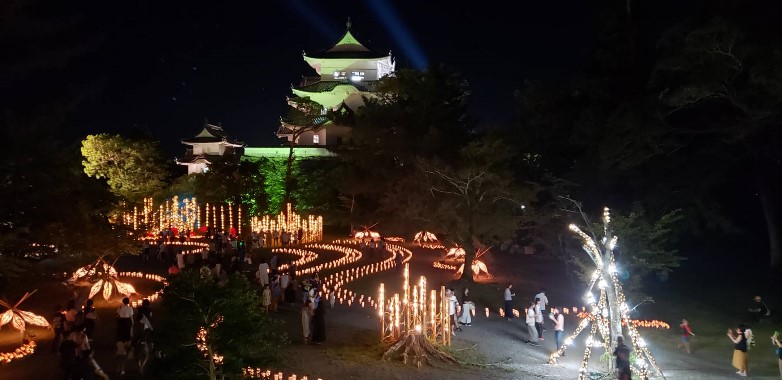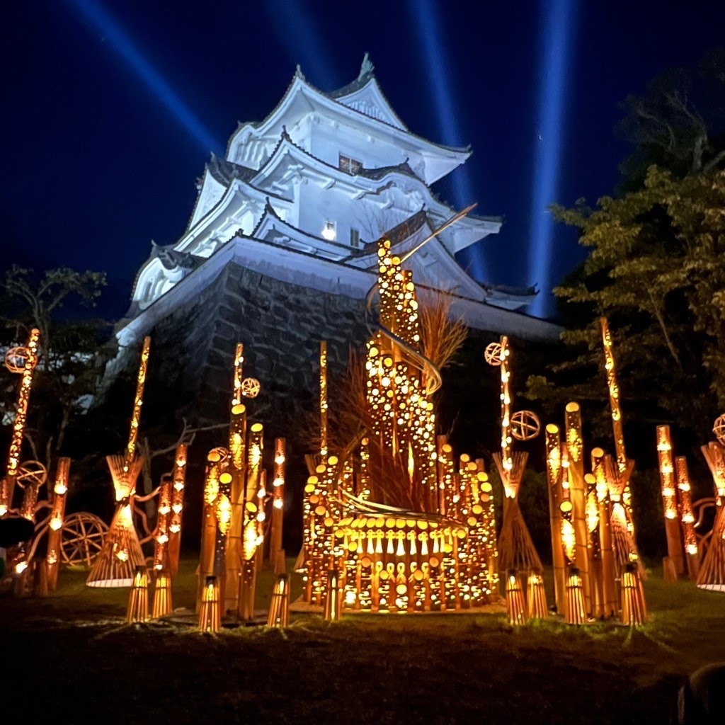 上野公園内の伊賀上野城本丸広場では、「伊勢志摩サミットおもてなし竹あかり」の制作なども手掛けた伊賀市在住の竹灯りアーティスト・川渕皓平さん(canaarea代表)と、BUNTO(伊賀市文化都市協会)が竹灯り空間を演出。
