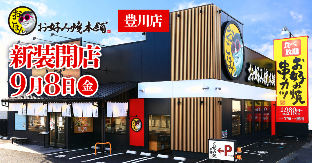 豊川市牛久保町の「お好み焼本舗 豊川店」が2023年9月8日(金)に新装開店。新たに導入したオープンキッチンにより活気のある店内で、職人がひとつひとつ丁寧に焼き上げたお好み焼をはじめ、串カツや鉄板焼きなどバラエティに富んだメニューを堪能してみてはいかがでしょうか。