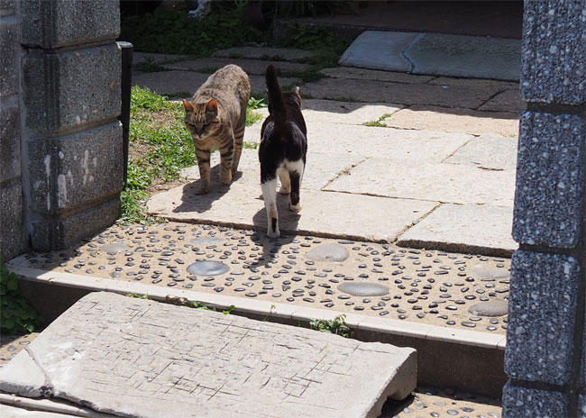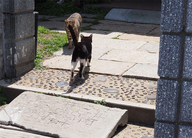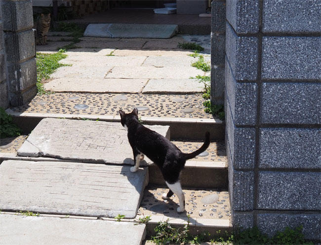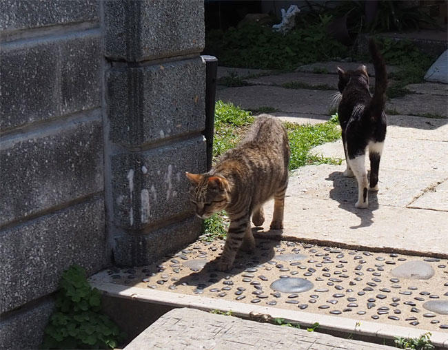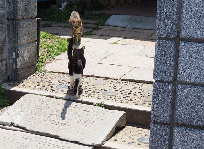 更に進むと、帰ろうとしている白黒さんと待っているキジトラさん。