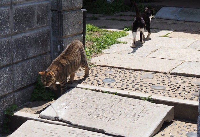キジトラさんの尻尾は下を向いています。さあ、パトロールですね。