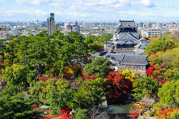 矢作川のほとりにたたずむ岡崎城(再建)と岡崎の街並み