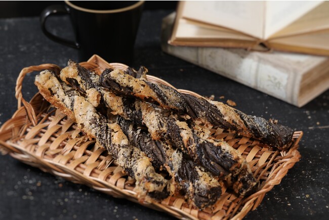 「ブラックフライデーチョコリング」の生地に、卵白とグラニュー糖をプラス。サクサクに焼き上げた杖のような形が特徴のお菓子は、あと1本、あと1本、これで最後・・・と伸びる手が止まらないほど、軽い食感がやみつきになりますよ。